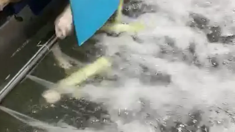 Auf dem Austragsband wird das Gemüse mit Frischwasser abgesprüht.