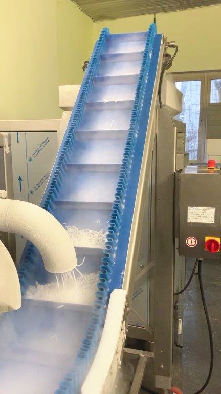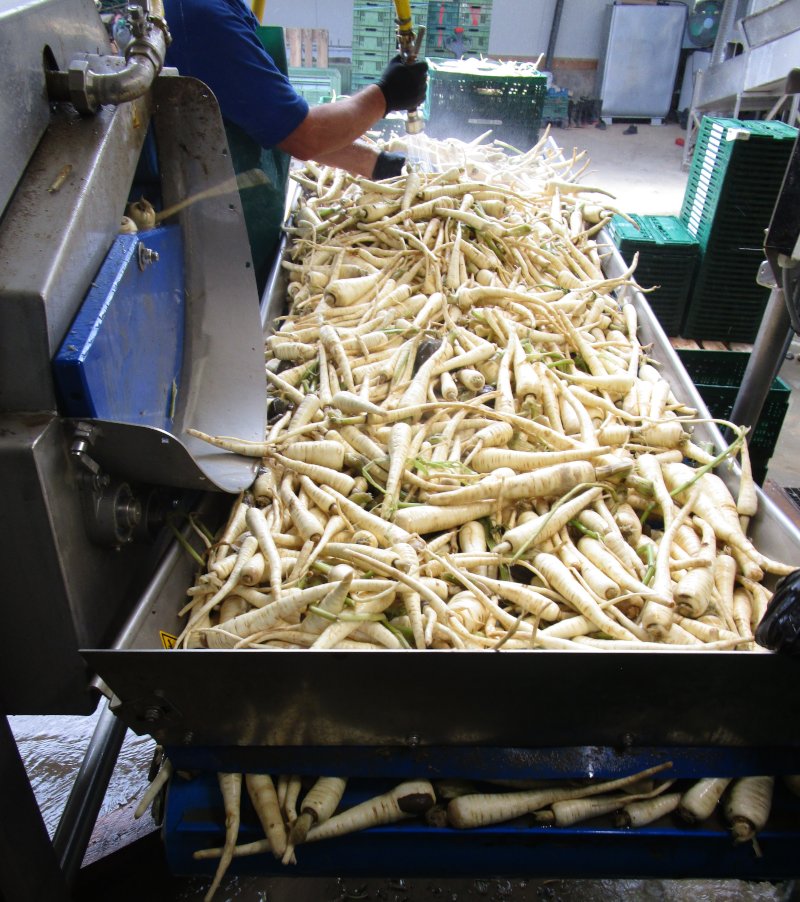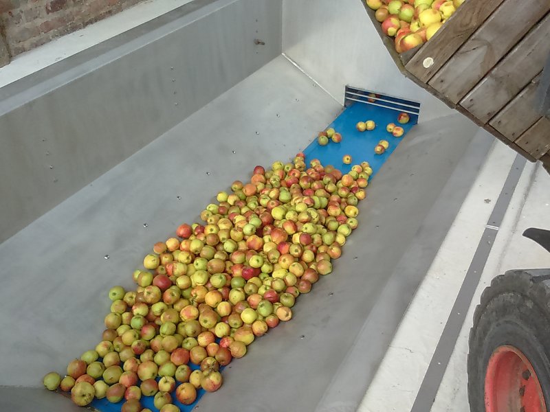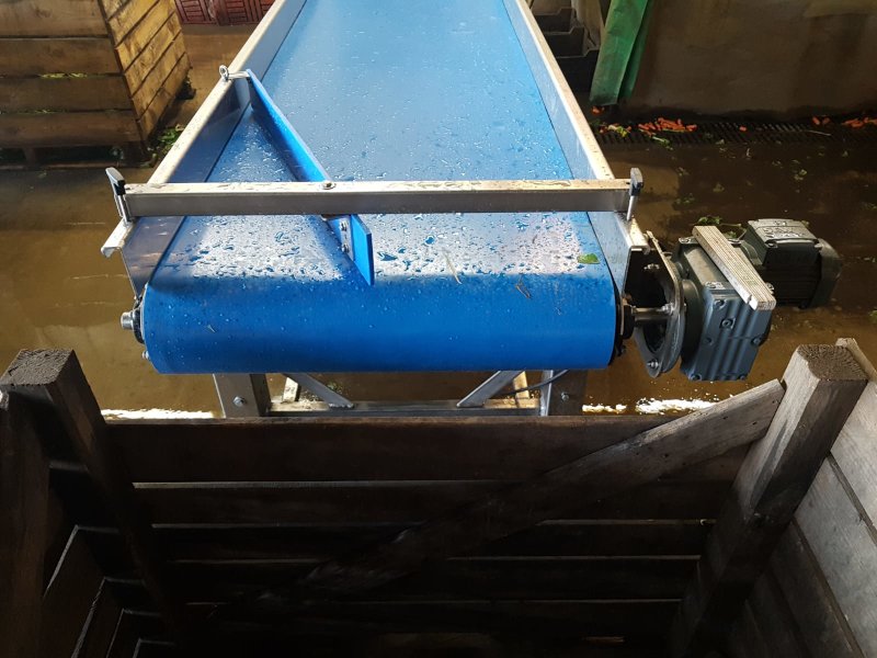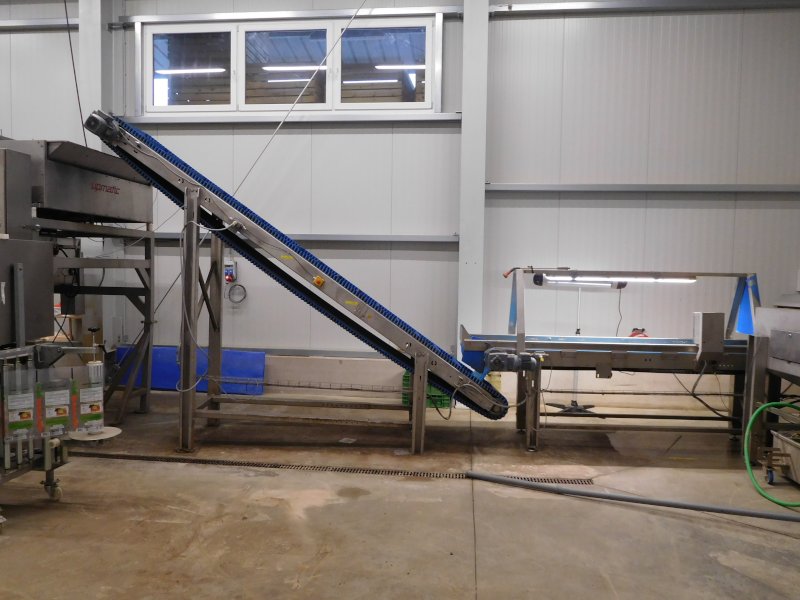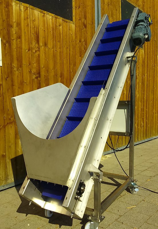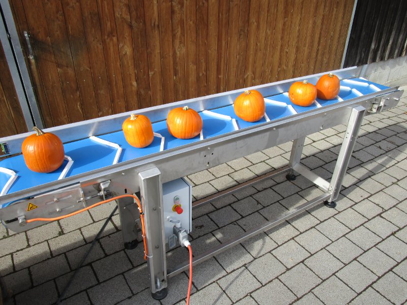 Der Vorratsbunker mit Förderband dient vor allem zur Lagerung und Zufuhr von Obst und Gemüse Der Hochförderer dient zur Beförderung von Obst und Gemüse bei einer Ansteigung Förderband mit Mitnehmer für Krautköpfe, Kürbisse, usw.