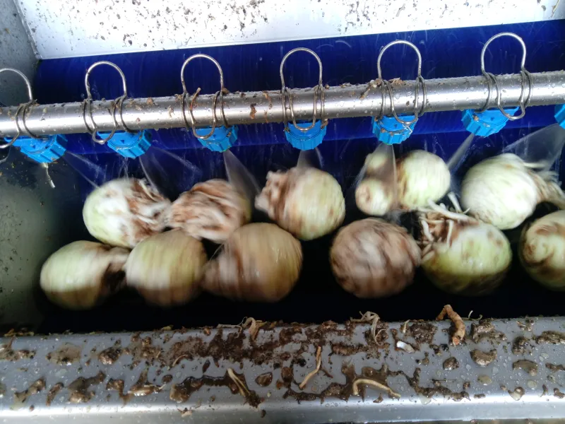 Die Rotation der Bürsten versetzt das Gemüse in eine Drehbewegung.
