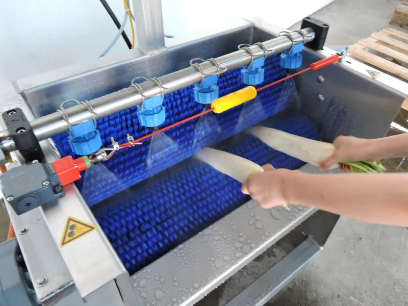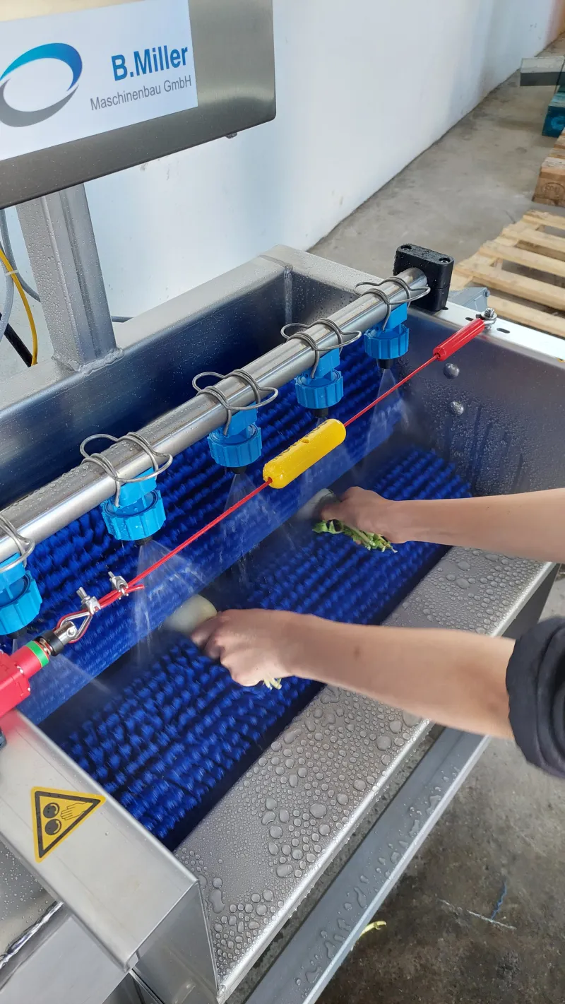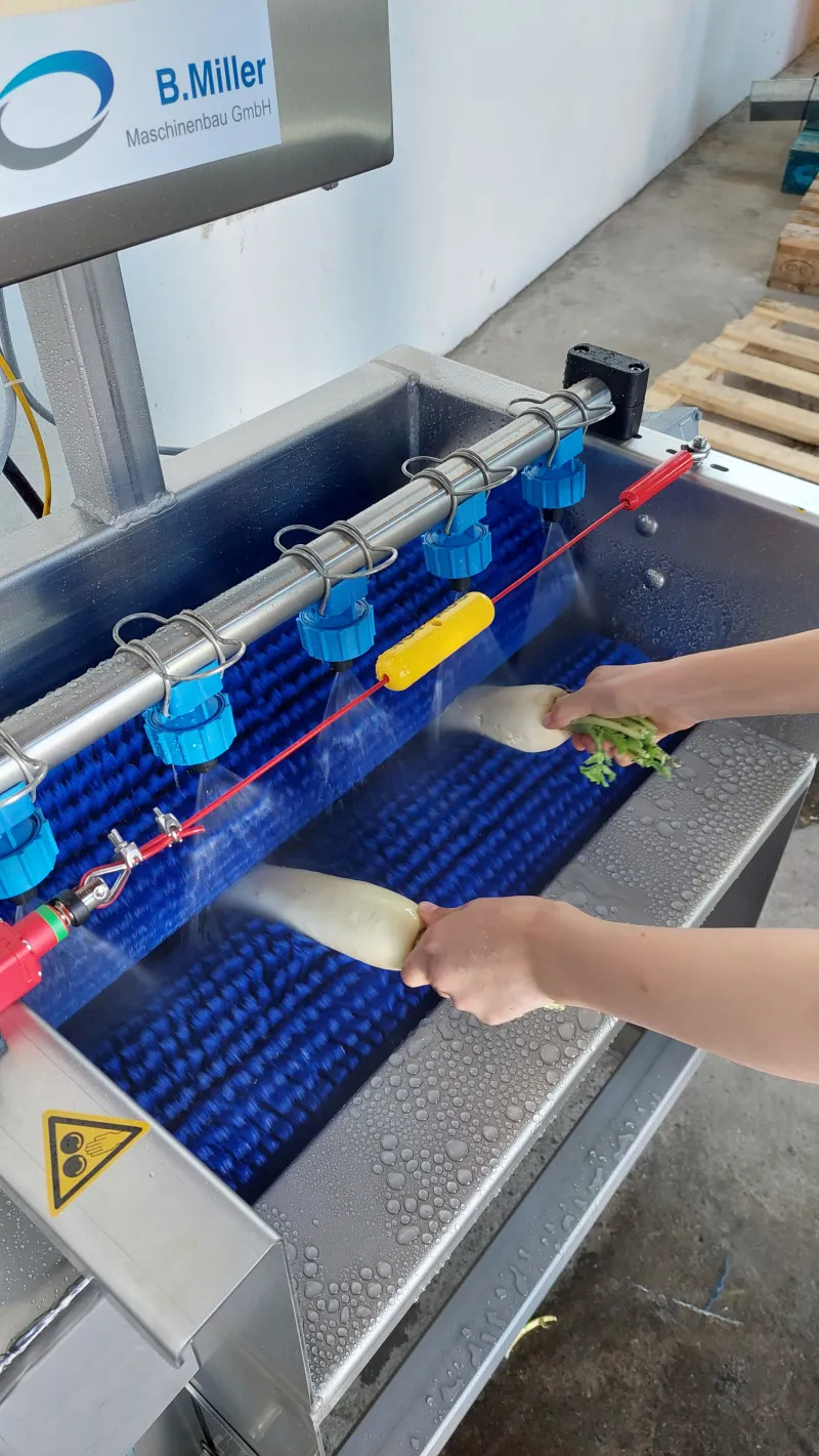 Die Rettiche werden über Düsen mit Wasser besprüht.