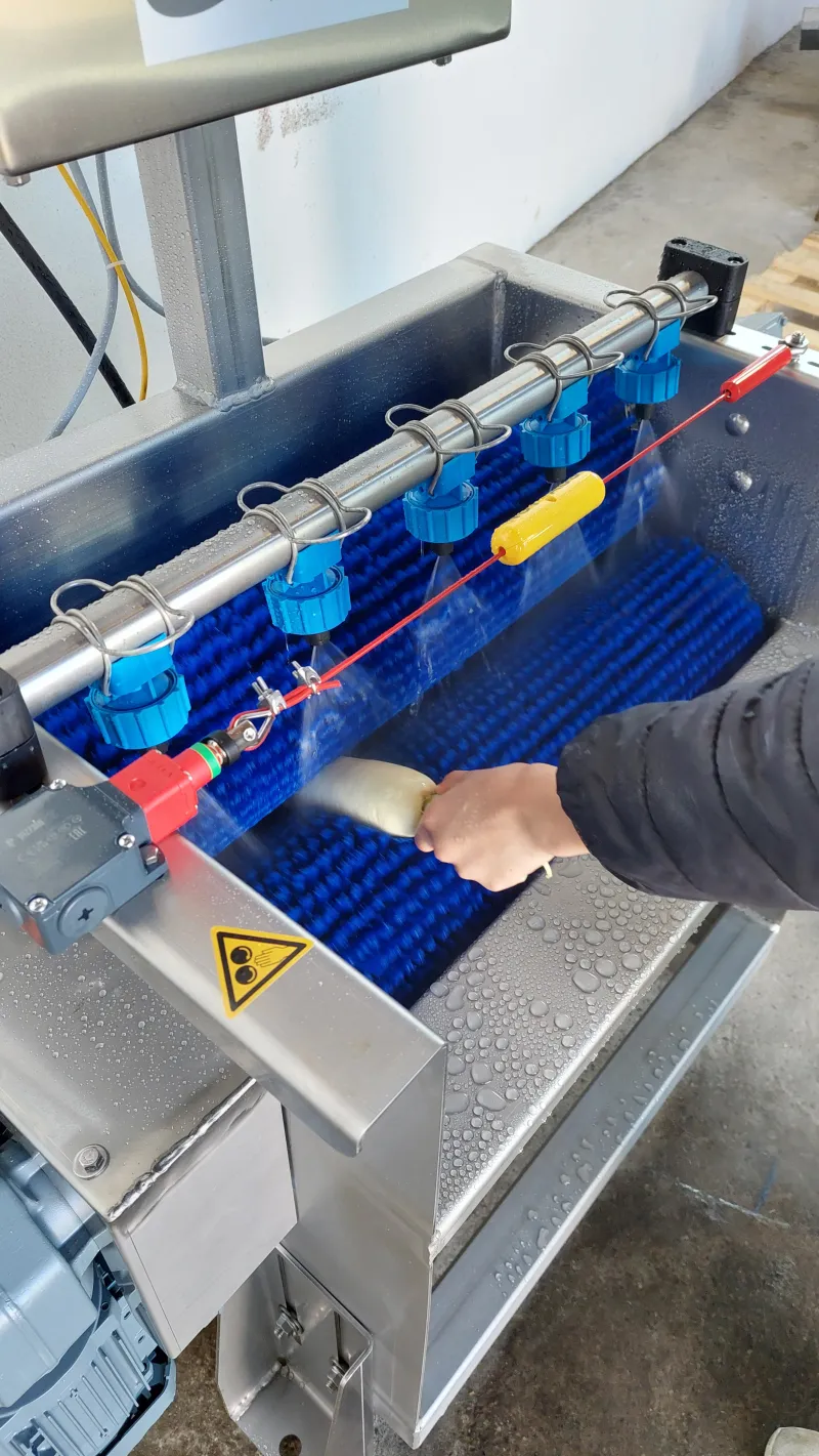 Der Rettich wird per Hand zwischen die rotierenden Bürsten gehalten.