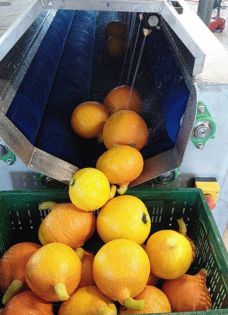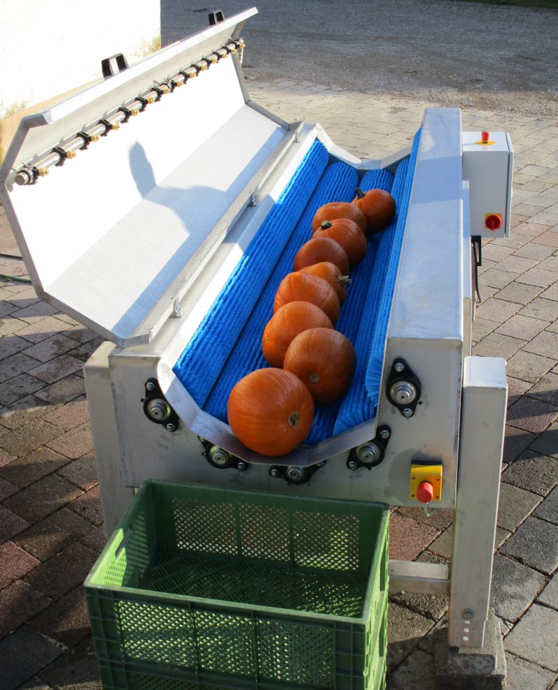 Unsere Kürbiswaschmaschine garantiert sanftes und gründliches Waschen von Kürbisse ohne den Stiel, Strunk oder Stängel zu verletzen.