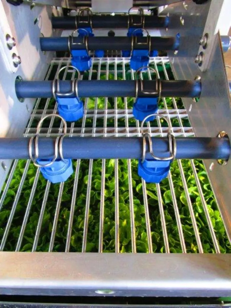 Durch erneutes Auslösen der Wippbewegung fährt das gewaschene Gemüse nach oben und wird mit Frischwasser abgesprüht.
