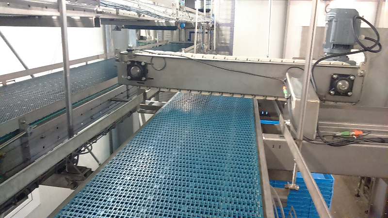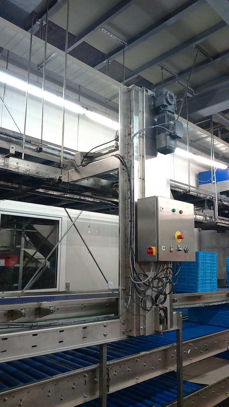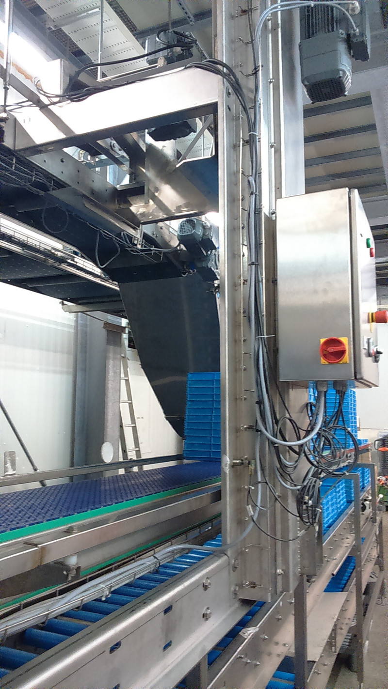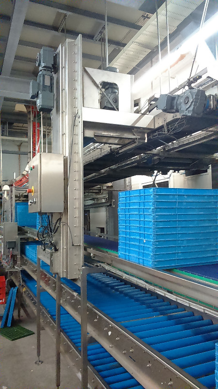 Der Tablar-Stapler stapelt vollautomatisch eine bestimmte Anzahl von Tablaren aufeinander und befördert diese zum gewünschten Punkt.